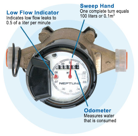5. Inspect you home for water leaks. You can do this by turning off all water-using appliances and then going to your water meter box to see if the water dial continues to move. The best resource we have found for finding and fixing water leaks is smarthomewaterguide.org. Water meters have a leak detection dial, indicated below: